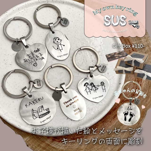 必ずこちらの商品ページの文面もしくは 画像の手順に目を通していただきご注文へお進み下さい♡ ⚠︎⚠︎⚠︎ ★BABYデザインで製作希望の場合だけ LINEに送っていただく内容が変わります。 こちらの文面の ”★BABYデザイン★”を必ずご確認くださいませ。 _______________________________ オーダーの流れは、 他のMy own key ringと一緒です♩ ●イラストなど彫刻内容は Jayme.SHOP公式LINEへ LINE ID → @570nhqel _______________________________ 大人気My own key ringに新しく ステンレス素材の"SUS"が加わりました♩ 形は3種類、 男性も身につけていただきやすいcoolな質感です! coolで可愛いハート形♡ 男女関係なく身につけやすい、だ円形☺︎ 存在感抜群の丸○ ▪︎だ円形のみ縦横の向きをお選びいただけます。 _______________________________ 今しか描けない 子どもらしさ溢れる絵とメッセージを My own key ring 『私だけのキーリング 』 として残してみてはいかがでしょうか♥︎ _______________________________ 【オーダー方法】 ①絵を描く 白い無地の紙に黒マジックで しっかりと描いてください⭐︎ •濃い色の線の方が綺麗に彫刻できます •描くものはマジックがおすすめです ⚠︎⚠︎工作の作品は不可⚠︎⚠︎ ※鉛筆・ボールペン・シャーペンなど 薄い色や線が細くて彫刻機に反映されない絵は 再度描き直しをお願いいたしますので ご了承くださいませ。 差し支えがなければ お母さまが上から黒マジックでなぞった物を お送りいただいてもかまいません ↓ ②撮影する 明るい場所で影が入らないように 正面から撮影してください •明るい部屋の壁に貼ってお撮りいただくと 綺麗に撮影できます☺︎ ※影が入っていたり画像不鮮明などの場合 撮り直しをお願いすることがございます ↓ ③注文 形と(ハートorだ円形or丸) 希望個数を選んで注文。 •ラッピング希望の方はBOXをご選択ください ↓ ④彫刻内容をLINEで送信 ⚫︎Jayme.SHOP公式LINEへ LINEの「友達追加」から @570nhqel を検索するか、 商品ページにも載せてあります画像をスクショして QRコードをスキャンしてください。 ________________________ ❶ご注文者様のお名前 ❷形(ハートorだ円形or丸) ❸FONT1~5から選択 以上を一旦送信、 ❹裏の文字の内容 ❺絵のお写真 _______________________ 上記の内容をLINEへお送りください。 ◾️裏も手書きのデザインにされる場合、 ❸❹は飛ばして❺の後に裏に入れるデザインをお送りください♡ ◾️複数ご購入いただいている方は ❷〜❺を 1個分ずつ分けてお送りください ❹に関しまして •文字は全て中央寄せでこちらで調整いたします。 ⚠︎ 予測変換で入力すると 稀に間違いが生じてしまいます。 特に英語の綴り等は 一文字ずつ確認して打っていただき 改行、スペース、ピリオドの有無 大文字小文字の区別にもご注意下さい。 間違い防止の為、 お送りいただいた文字は そのままコピーして彫刻に入ります。 送り間違いによる作り直しには 再度商品代がかかりますので お気をつけくださいませ。 ★BABYデザイン★ ★赤ちゃんの足形デザインで製作希望の場合は 以下内容をお送りください ________________________ 1、ご注文者様のお名前 2、形(ハートorだ円形or丸) 3、赤ちゃんの下の名前(ローマ字) 4、生年月日 5、出生時間 6、身長.体重 7、絵文字(7種類,なし から選択) 8、手や足形スタンプの写真 (片方ずつ送って頂いてok!) _______________________ LINEを送って頂いた方から順次製作に入ります。 お手元に届くまで数日お待ちください⭐︎ ※お送りいただいた彫刻内容に不明点があった場合、 確認が取れ次第の製作になりますので必ずご対応お願いいたします。 _______________________________ 【商品詳細】 ▪︎形 A:ハート B:だ円形 C:丸 ▪︎SIZE ハート...3cm だ円形...3.5cm 丸..........3.5cm (リングを除いた本体の一番長い部分のサイズ) _______________________________ -My own key ringラッピングについて- 「ポリエステル素材を最小に、ゴミを増やさない」 ★eco包装を通常包装にしました! ※専用のギフトBOX希望の方は 【My own key ring専用ラッピング】 ¥110- を必要個数分をご購入お願いいたします。 ▪︎BOXのサイズはS M Lの3サイズ サイズに関わらず1つ110円です。 ▪︎入れれるキーリングの個数 S…1つ M…2つ L…3つ~5つ 入れたい個数に沿ったサイズをお選びください。 _______________________________ ✉︎こちらの商品はクリックポストで大阪から発送いたします。 ▪︎劣化の原因となりますので 濡れたままの放置はされないようお気をつけください。 ▪︎鍵等、他の固い金属と一緒に持ち歩きますと傷がつきやすいです。 優しくお取り扱いをお願いいたします♡