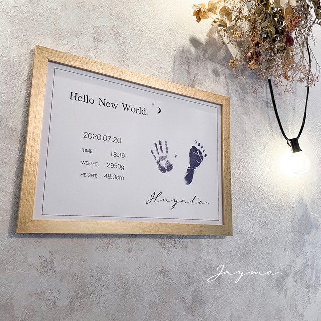 Hello World ⋒ A5,A4サイズが選べるbaby poster A4サイスは一般的な大きめサイズ、 A5サイズ(A4の半分)は、 生後1ヶ月くらいまでの赤ちゃん向けの コンパクトな足型ポスター♥︎ ※足形のサイズが収まりきらない等 お客様のご都合によります返品交換は致しかねますので サイズが不安な場合はA4サイズをご選択ください。 ⭐︎ 画像6.7.8.9枚目→A5ポスター、 モデルの赤ちゃんは 生後2週間、足のサイズは8cmです _______________________ シンプルで可愛らしいデザインをお探しのmamaにぴったり Jayme.original足形ベビーポスター⺌ 画像6枚目の状態でお送りいたしますので お客様ご自身でスタンプして完成させてください☺︎ ↪︎2枚入りですので、 おじいちゃんおばあちゃんへプレゼントしたり 押し直し用としてもお使いください。 3枚目以降は1枚追加ごとに¥500でお作りいたします。 ▪︎サイズ...A5orA4 ▪︎厚手(一般的な写真の厚さ) ▪︎内容‥.ポスター2枚 ※フレーム別売り ※3枚目からは 【ベビーポスター(手足型)1枚追加ページ】 (1枚追加/¥500) を同時に購入お願いいたします。 ▪︎ご注文方法 ご購入の際備考欄に お子様の ①お名前(ローマ字・漢字) ②西暦生年月日(2020/01/01) ③生まれた時間(am.pm12時間表記) ④出生時の体重 ⑤出生時の身長 を必ずご記入ください。 例) Sakuto 朔夜 2023/07/01 03:18am 2748g 47cm ※備考欄に書き忘れた場合はLINEへお送りください ご記入頂いた内容でお作りいたしますので お間違いのないよう、お願いいたします。 __________________ ※フレーム、インクは別売りです。 __________________ ⚠︎ caution⚠︎ •折り曲げ、水濡れ厳禁 •変形や色あせの原因となる場合がございますので 直射日光や湿気の多い場所での保管は避けてください 長くお楽しみいただけるようお取り扱いにご注意ください。 —————————————————————— ママ達の気持ちを乗せて作るJayme.SHOPの商品は あなたが持つことで価値が生まれると思っております。 お客様の手に渡った時に どんなハイブランドよりも価値があると思っていただける そんな商品を作りたくて日々企画、製作をしております♡
