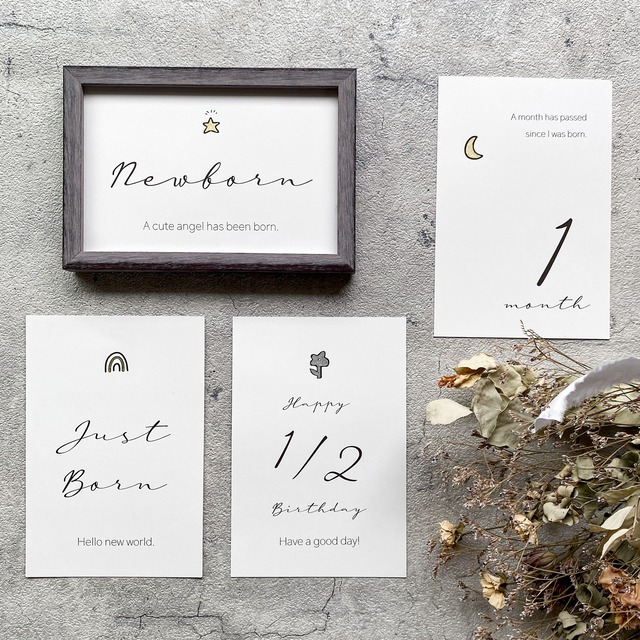 monthly card 15 sheet SET. ______________________ シンプルながらも美しいデザインの Jayme.original マンスリーカードが 毎月の月例フォトや 産まれてから初めての1年間で訪れる特別な日々を彩ります。 空きスペースに足型を残すのも◎ ______________________ ▪︎Point それぞれのanniversaryにモチーフをデザインし、 一枚一枚メタリックのシルバー・ゴールドで 手作業でペイントしております。 ▪︎ハガキサイズ 100mm×148mm ▪︎セット内容 ・Newborn ・Just born ・100Days ・1/2 Birthday ・Happy Birthday ・1.2.3.4.5.7.8.9.10.11 months ※6monthsは1/2 Birthday、 12monthsはHappy Birthdayになります。 ベビーポスター・フレームは別売りです。 ______________________ ⚠︎ caution⚠︎ •折り曲げ、水濡れ厳禁 •直射日光や湿気の多い場所での保管は避けてください ハンドメイド商品ですので、 完璧を求められる方はご購入をお控えください。 マンスリーカード/月齢カード