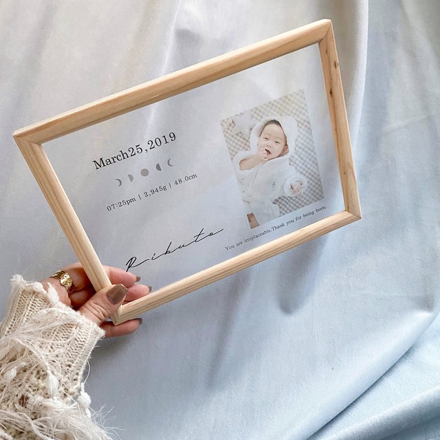 Clear baby poster シンプルで珍しいクリアベビーポスター⁎ଂ __________________ ●お写真など彫刻内容は Jayme.SHOP公式LINEへ LINE ID → @570nhqel __________________________________________ ※こちらは縦向き写真用のデザインになります。 お送りいただきましたお写真が横向きのお写真の場合は 横向き写真用のデザインへ変更してお作りさせていただきます。 (お写真のサイズが小さくなるのと 周りの文字などの配列を変える必要が生じる為) 予めご了承くださいませ。 ※こちらの商品は通常の包装でも そのままプレゼントとしてお渡しできるよう、 お包み致しますので ラッピングの選択は不要となっております。 ※お子様の内容をLINEにお送り頂いた日から 土日祝を除く平日1〜3日以内での発送となります。 __________________ ▪︎Jayme.オリジナル クリアベビーポスター 木製フレーム付き(ホワイト or ナチュラル) こちらの商品は手足形ポスターと違って 完成した状態でお届け致しますのでそのまま飾っていただけます。 お友達の出産祝いや おじいちゃん、おばあちゃんへのプレゼントにも♡ __________________ ▪︎ご注文方法 ご購後Jayme.SHOP公式LINEへ LINE ID → @570nhqel 下記内容をお送りください。 ①ご注文者様のお名前(フルネーム) お子様の↓ ②下のお名前のみ(ローマ字) ③西暦生年月日(2020/01/01) ④生まれた時間(am.pm12時間表記) ⑤出生時の体重 ⑥出生時の身長 ⑦お気に入りのお写真1枚(縦向き写真) ※お写真は全体的に色の濃いめのものをお選びいただいた方が キレイに仕上がりやすいです。 ご記入頂いた内容でお作りいたしますので お間違いのないよう、お願いいたします。 ⚠︎ご注文後24時間以内にLINEがない場合 こちらからお電話にてご連絡させていただく場合がございます。 その後3日以内に一切ご返信がない場合は キャンセル扱いとなりますのでご了承くださいませ。 ・写真に迷われてる場合やLINEでのご連絡が遅れる場合は ご購入時の備考欄に 『○月○日頃までに送ります』とご記入くださいませ。 __________________ ▪︎A5サイズ ▪︎セット内容 ・クリアポスター ・フレーム付(ホワイトorナチュラル) __________________ ⚠︎水に濡れるとインクが滲む可能性がございます。 色あせ、よれの原因になりますので直射日光を避けて保管してください。 ハンドメイド商品ですので、 完璧を求められる方はご購入をお控えください。 クリアポスター/ベビーポスター/ベビーボード 命名書/名入れ/出産祝い/敬老の日プレゼント